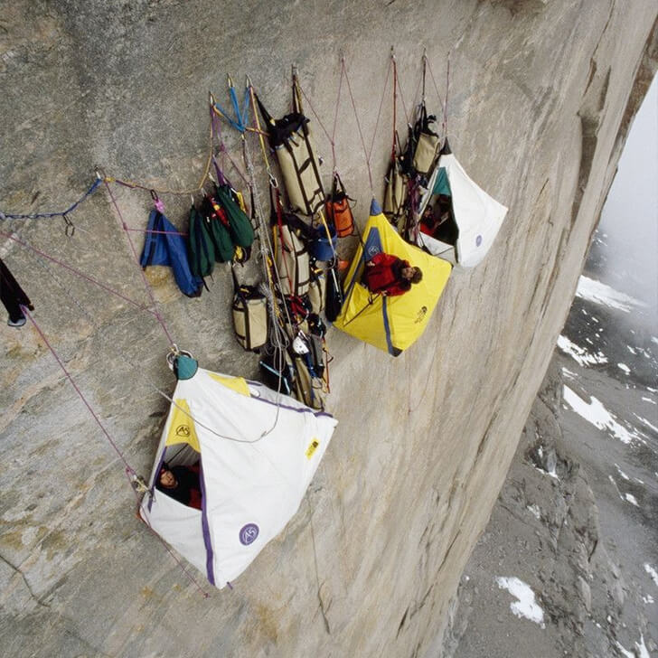Für diejenigen, die den Nervenkitzel suchen, reicht das Klettern nicht aus; sie bauen ihre Lager direkt an den steilen Wänden auf und verbringen die Nacht dort, wo andere nicht einmal zu klettern wagen. Ein herkömmliches Zeltlager am Boden erscheint ihnen wahrscheinlich als zu gewöhnlich. Diese mutigen Seelen sind jedoch mehr als bereit für die Aufgabe und haben ihr Lager sorgfältig und sicher eingerichtet. Es bleibt die Frage, wie man so überhaupt ein Auge zumachen kann?