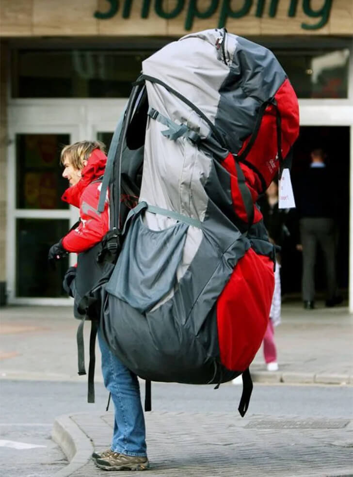 Das Wort “Backpacker” lässt üblicherweise ein Bild von Reisenden mit einem überschaubaren Gepäck auf dem Rücken entstehen. Doch das Bild, das uns hier präsentiert wird, entspricht keineswegs dieser Annahme. Der Mann im Bild ist zwar mit einem Rucksack ausgestattet, doch dessen Ausmaße überschreiten bei Weitem das, was gewöhnlich getragen werden kann. Es wirkt fast so, als hätte er seinen gesamten Hausstand mit auf die Reise genommen.