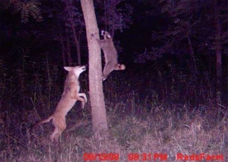 Ganz zum Missfallen des Fuchses, der offensichtlich bereits auf ein köstliches Abendessen gehofft hatte. Mit Frustration und Wut springt er um den Baum herum, in der Hoffnung, noch nach den Hinterbeinen seines Mitternachtsschmauses schnappen zu können. Ob ihm das gelungen ist, wissen wir nicht, doch wir hoffen, dass er sich noch rechtzeitig in Sicherheit bringen konnte.