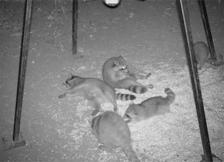 Diese kleinen Waschbär-Schurken sind immer für eine lustige Show zu haben! Keine Mülltonne ist vor ihnen sicher, wenn sie auf ihrer nächtlichen Tour durch die Nachbarschaft ziehen und aus unseren Abfällen ein kulinarisches Festmahl genießen. Schaut euch nur diese vier Halunken an, sie scheinen gerade von ihrem nächtlichen Beutezug zurückgekehrt zu sein!