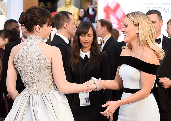 During the 2015 Oscars, Reese Witherspoon and Felicity Jones added a playful twist to their red carpet greeting, opting for a wrist shake instead of the usual handshake. This moment took place when both actresses were dressed to impress: Reese in a black and white Tom Ford gown and Felicity in a silver Alexander McQueen dress.