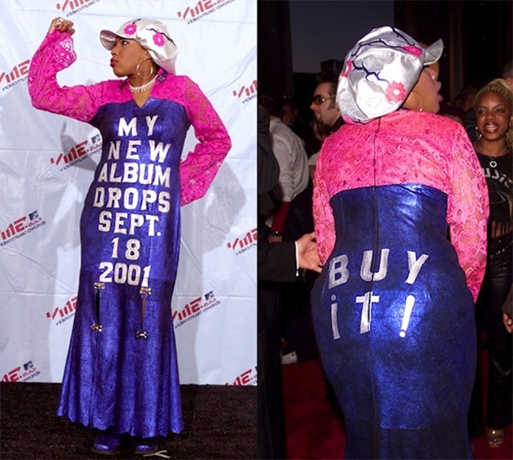 At the 2001 MTV Video Music Awards, Macy Gray turned heads and sparked conversations with a dress that served as a billboard for her upcoming album. Her outfit announced, “My new album drops Sept. 18, 2001,” with the phrase “Buy It” printed across the back, making it one of the most unforgettable red carpet outfits.