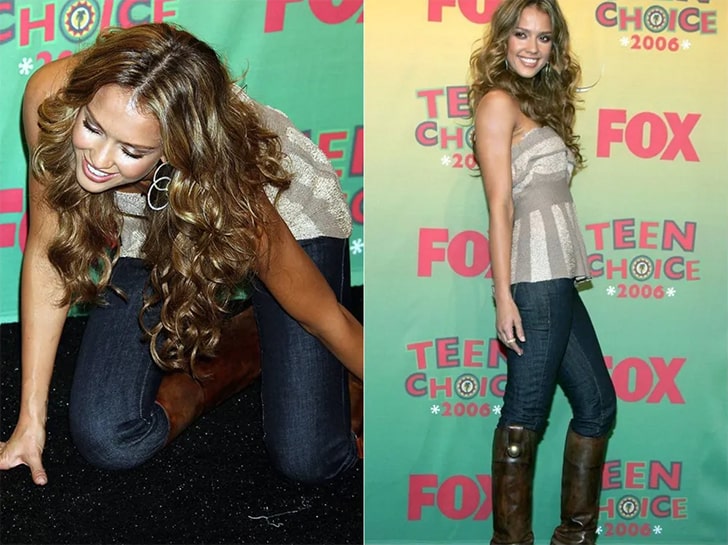 In 2006, Jessica Alba brought an unexpected twist to the Teen Choice Awards with a playful stumble on the red carpet. The event, held in Universal City, California, saw Jessica dressed casually yet stylishly in a striped tank top, jeans, and knee-high boots—a look that matched the youthful spirit of the awards.