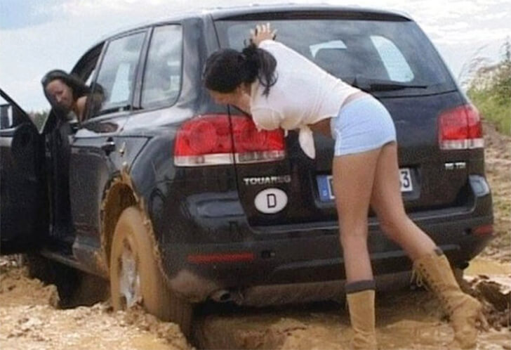 Wir können beinahe hören, wie diese Frauen besorgt stöhnen, als sie sehen, dass sie mit ihrem Auto im Schlamm stecken geblieben sind. Während die eine versuchte, das Auto aus dem Schlamm zu schieben, entdeckte die andere in der Zwischenzeit ein unerwartetes, aber naheliegendes Problem: Ihre hochhackigen Stiefel waren eher ein Hindernis als eine Hilfe. Das war bestimmt nicht einer der Momente, in dem sie ihre Kräfte mit den schicken Schuhe hätten messen wollen!