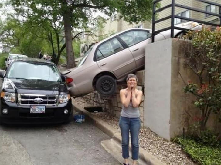 Wie konnte diese Frau es jemals riskieren, ihr Fahrzeug an der steilen Seite eines Gebäudes zu parken? Es ist sehr wahrscheinlich, dass sie es versäumt hat, die Handbremse zu ziehen und so rutschte das Auto weg und prallte gegen den ebenfalls dort geparkten Ford.