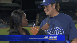 Was wir hier auf diesem GIF sehen wirkt fast wie die Origin-Story eines Superhelden. Der Starspieler der Tampa Bay Rays, Evan Longoria, rettete Kenny Mayne von ESPN an seiner Seite quasi das Leben, als er mit bloßen Händen einen Flyball auffing, der direkt auf die Reporterin zuflog, und das obwohl er mit dem Rücken zum Spielfeld stand!