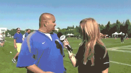 Amy Campbell von Fox Sports hat 2013 bewiesen, dass sie für eine gute Story selbst einen Schlag ins Gesicht einstecken kann. Am Rande des Spielfelds im Nike-Hauptquartier in Beaverton, Oregon, berichtete die Reporterin über das kommende Spiel und führte ein Interview, als sie von einem Football-Star überrumpelt wurde.