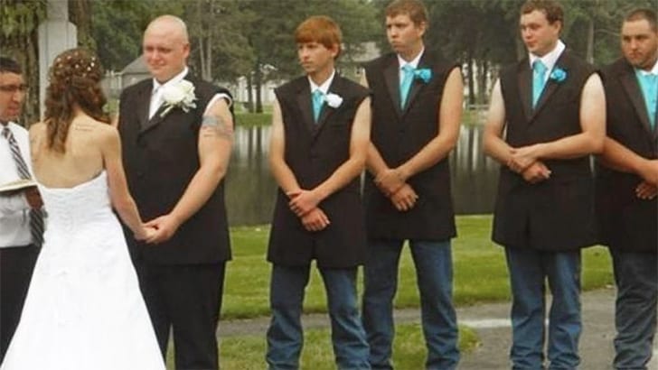 Die Männer tragen alle ärmellose Hemden und Blazer, auch der Bräutigam. Kombiniert mit einfachen Jeanshosen, obwohl sich der Bräutigam zumindest hier als einziger für eine schwarze Stoffhose entschieden hat. Möglicherweise war dies ein reiner Plan der Männer, denn die Braut trägt auf dem Foto ziemlich konventionelle Hochzeitskleidung. Hoffentlich war sie eingeweiht und nicht sauer auf ihren künftigen Ehemann und seine schrille Wahl des Outfits.