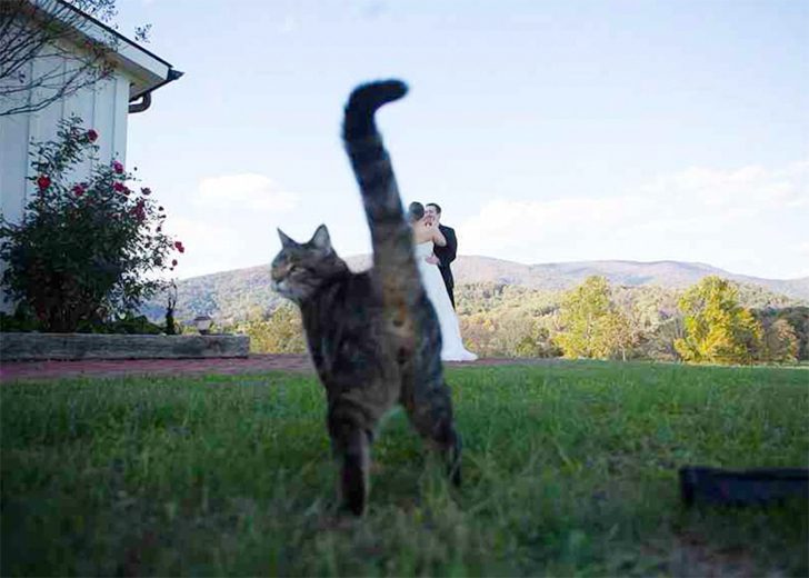 Das Brautpaar machte Fotos von sich auf einer Wiese mit einem idyllischen Bergblick im Hintergrund. Sie dachten sicherlich, sie würden gerade für ein perfektes und romantisches Foto posieren und bemerkten nicht, dass plötzlich das Hinterteil einer Katze die Kamera verdeckte. Vielleicht wollte die Familienkatze einfach mit auf das Bild? Zugegeben, der Moment war unpassend, aber das Foto hat sicher für viele Lacher gesorgt.