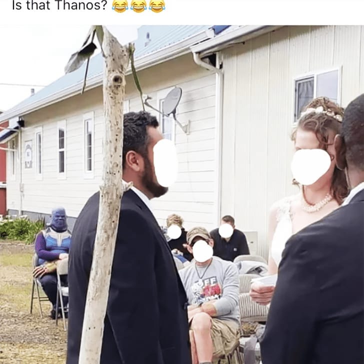Niemand Geringeres als Thanos, der intergalaktische Superschurke aus den Marvel Comics! Offensichtlich hat jemand die Einladung als Gelegenheit genutzt, um in voller Schurkenmontur aufzutauchen. Aber eines muss man dem Gast lassen: Er hat sich Mühe gegeben. Mit seinem Infinity Gauntlet-Handschuh sieht er aus wie direkt aus dem Marvel-Film entsprungen. Um solche Überraschungen zu vermeiden, sollte das Paar bei der nächsten Feier vielleicht doch eine Kleiderordnung festlegen.