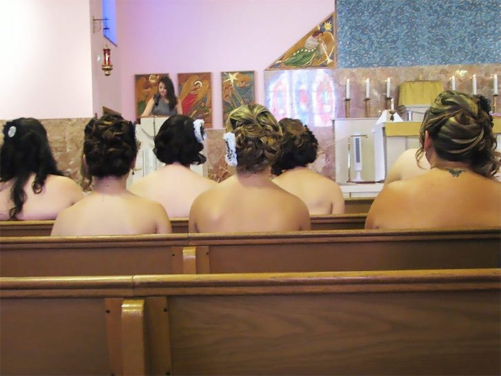 Ist das ein Outfit für die Kirche? Auf den ersten Blick könnte man meinen, die Mädels sitzen alle oben ohne auf der Kirchenbank. Das wäre ohne Frage ein Skandal. Aber nein, keine Sorge, es handelt sich nur um trägerlose Oberteile oder sogenannte Röhrenoberteile, die man wegen der Kirchenbank nicht sehen kann.