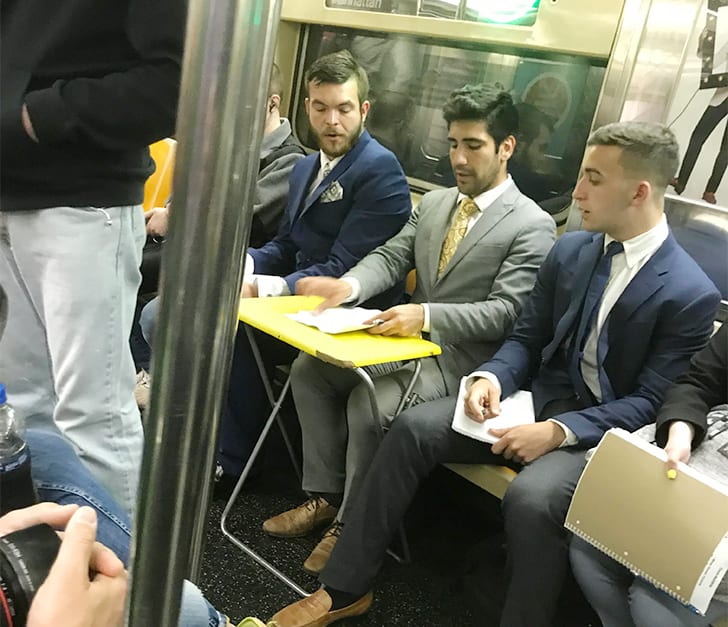 Three businessmen in suits stand out among other riders, transforming their commute into a dynamic rehearsal space for their investor pitch. As they trade ideas and refine their delivery, other passengers find themselves eavesdropping on a live performance of ambition and strategy.