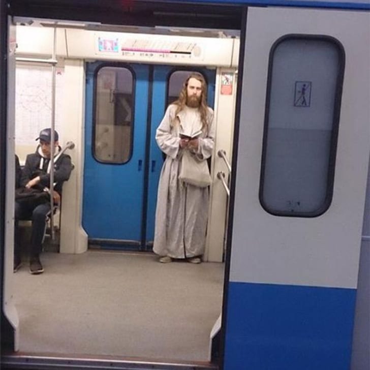 If you’re on this subway and think you’ve caught the express line to heaven, don’t be alarmed—it’s just a man whose appearance strikingly resembles Jesus. With his tunic, beard, and long hair, not to mention a book that might well be the Bible clutched in his hands, he’s a sight that attracts attention.