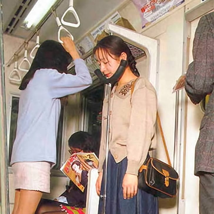 A woman stands, resting her face on a chin support, embodying the quirky genius of Kenji Kawakami’s Chindōgu. This invention, designed to offer a simple solution to the minor inconvenience of standing without support, also introduces a humorous complexity to problem-solving. Chindōgu, the art of inventing gadgets that solve one problem but might create another, is celebrated for its creativity and humor.