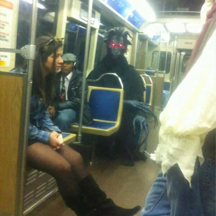 This costume is a nod to pop culture rather than a cause for alarm. Fusing fiction and reality on a public train highlights the playful side of Halloween, where the lines between the eerie and the entertaining blur. This unexpected encounter adds a dash of intrigue to the day.