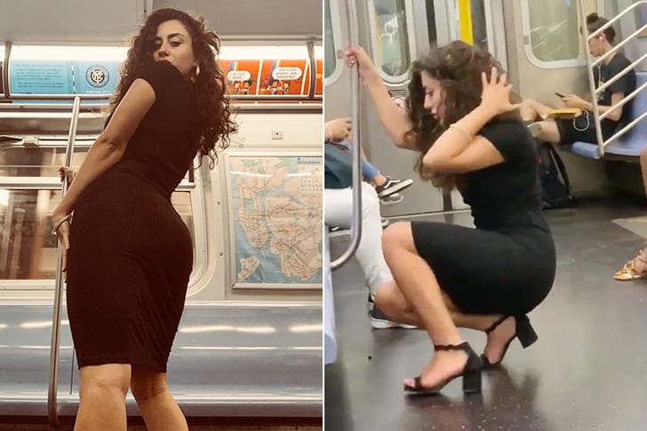Jessica George shot to fame when a video of her taking selfies on the subway was shared online. Now famously known as Subway Bae, she achieved this by cleverly propping her phone against her bag for the perfect angle. She wears a striking black dress and transforms the vehicle into her personal photo studio.