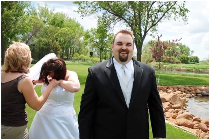 Att allting ska stå perfekt till under bröllopet är en dröm för de allra flesta brudarna, och som vi ser på denna bild vill hon verkligen att allt ska stå rätt till. När detta brudpar äntligen gått igenom hela ceremonin blev det dags för att ta en fin bild, dock var det en insekt som hade andra planer. Insekten hade så många alternativ på vem den skulle störa, och givetvis blev det slutliga valet bruden.