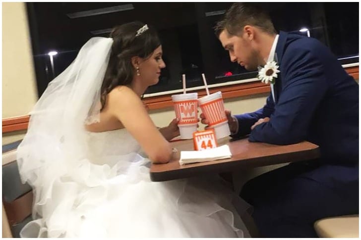 Vi brukar inte se ett nygift par sitta och käka på ett hak efter sin stora dag, men om det är vad paret vill så ska de väl få göra det? Om vi ser på denna bild är vi inte helt säkra på om detta var den ursprungliga planen eller om de suktade efter snabbmat efter sin stora dag, men oavsett blev det en speciell bild för dem att klistra in i albumet.