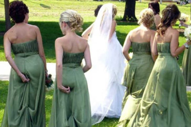 Vi kan ofta inte hållas oss då behovet att klia plötsligt uppstår, och som det tydligt syns i denna bild kunde heller inte brudtärnorna hålla sig från att klia. Om det kliar på en aningen speciell plats, skulle det vara fördelaktigt om man väljer att inte klia sig på en offentligt plats, eftersom man då kan hamna på bild. Även fast det resulterade i en rolig bild, kan vi tänka oss att tärnorna skämdes en hel del då de fick se bilden.