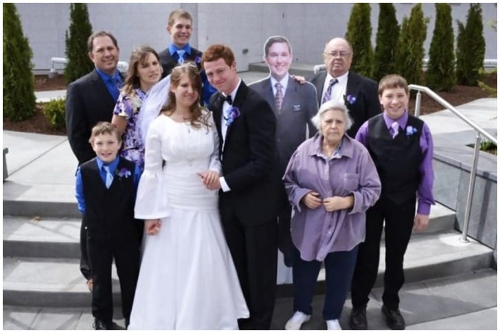 När vi ser på denna bilden kan vi tydligt se att en person inte hade möjligheten att besöka bröllopet, och av den enkla anledningen bestämde de sig för att istället skapa en kartong version av honom. Trots att detta var en kreativ idé att få med alla på bröllopsbilden, ser det aningen speciellt ut.