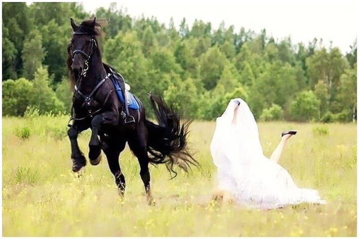 Som vi kan se är detta ett bröllopsfoto som definitivt var genant i stunden, men kom säkerligen att bli den mest minnesvärda situationen för detta nygifta par. Vi antar att bilden antingen kommer gömmas långt ned i en låda, eller tas fram då hela släkten suktar efter ett gott skratt. Osäkert varför bruden faktiskt hamnade av hästryggen, men kanske hästen för första gången i livet kände att det var hans tur att skina framför kameran.