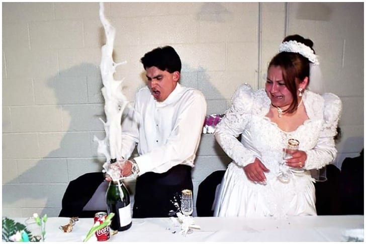 Den blivande maken kan anse det onödigt att utföra bröllop repetition, dock kan vi på denna bild tydligt se att denna nygifta man kanske borde övat på en så enkel uppgift som att poppa champagnen. Han var troligtvis beredd på att champagnen skulle bli den enklaste uppgiften han hade framför sig, men föga visste han att flaskan hade helt andra planer.