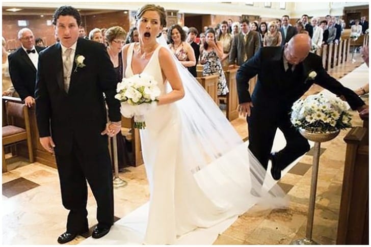 Dock var denna bruds pappa aningen klumpig av sig och när han lämnade över dottern till den blivande maken råkade han stiga på hennes klänning när han skulle gå och sätta sig. Vi hoppas sannerligen att klänningen inte gick sönder.