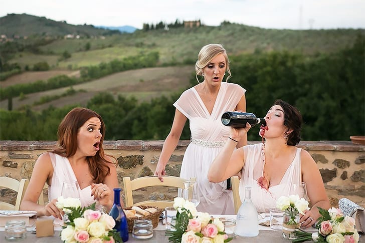 Oavsett vad det handlar om, hade kvinnan på detta bröllopet verkligen planer på att festa till det, tillsammans med en flaska vin. Man kan verkligen se i vännernas miner att det inte är första gången det händer. Vi hoppas kvinnan fått fira sin egna stora dag.