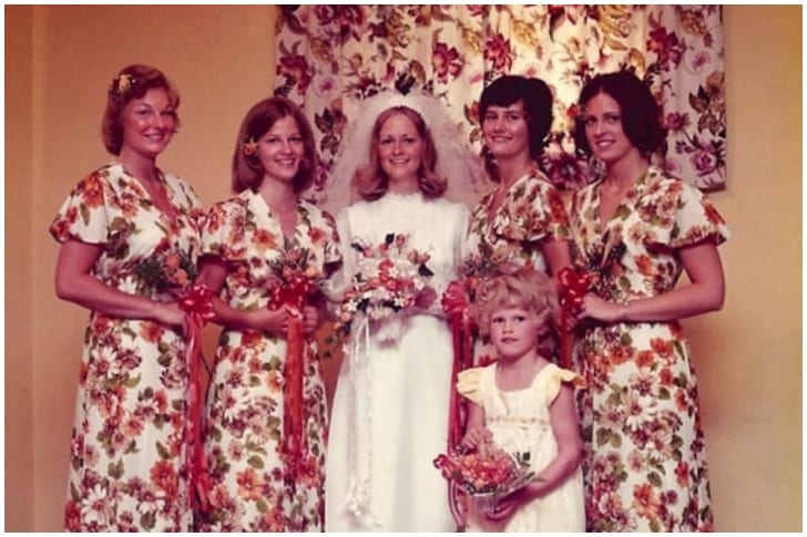 Det är verkligen extrem matchning när vi ser på både klänningarna och bakgrunden i denna bilden. Allting passar så väl ihop att till och med buketterna passar in i bilden. Åtminstone sticker bruden ut, vilket vi är glada över eftersom det är hennes stora dag. På bilden ser vi att alla ser glada ut, men frågan är om de ser lika glada ut då de kollar tillbaka på bilden där brudtärnorna näst intill smälter in.