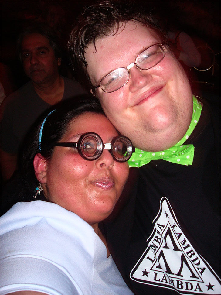 An endearingly plump couple celebrates their love for all things nerdy with unbridled enthusiasm. The dude sports a bright green polka dot bow tie, adding a splash of quirky charm to his outfit. But the real showstopper is his “Revenge of the Nerds” Lambda, Lambda, Lambda T-shirt—a proud nod to the classic cult film that champions the underdog.