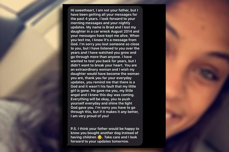 Essa é a mensagem que Chastity recebeu do antigo número do seu pai. Era de um homem chamado Brad que também estava tentando lidar com a perda de uma pessoa amada. Sua filha faleceu em 2014 em um acidente de carro e era ele quem estava recebendo as mensagens enviadas por Chastity.