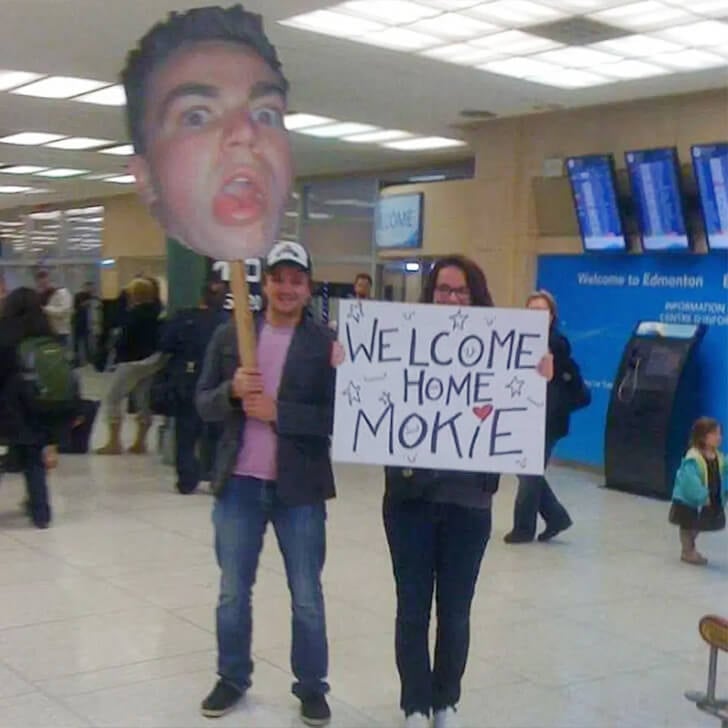 The moment Mokie touched down, he was greeted by a spectacle that perfectly encapsulated the essence of his friendship: laughter, creativity, and a touch of the absurd. As he navigated through the airport, he was instantly drawn to the unmistakable sight of his own enlarged, zoomed-in face, hilariously displayed on a stick by his two best friends, alongside a welcoming sign.